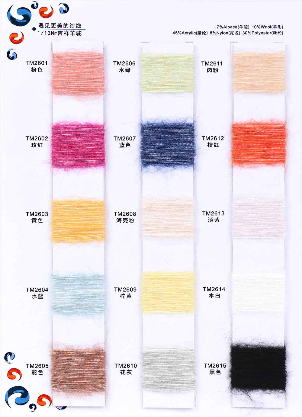 7%羊驼Alpace 10%羊毛Wool 8%尼龙Nylon 30%涤纶Polyester 45%腈纶Acrylic