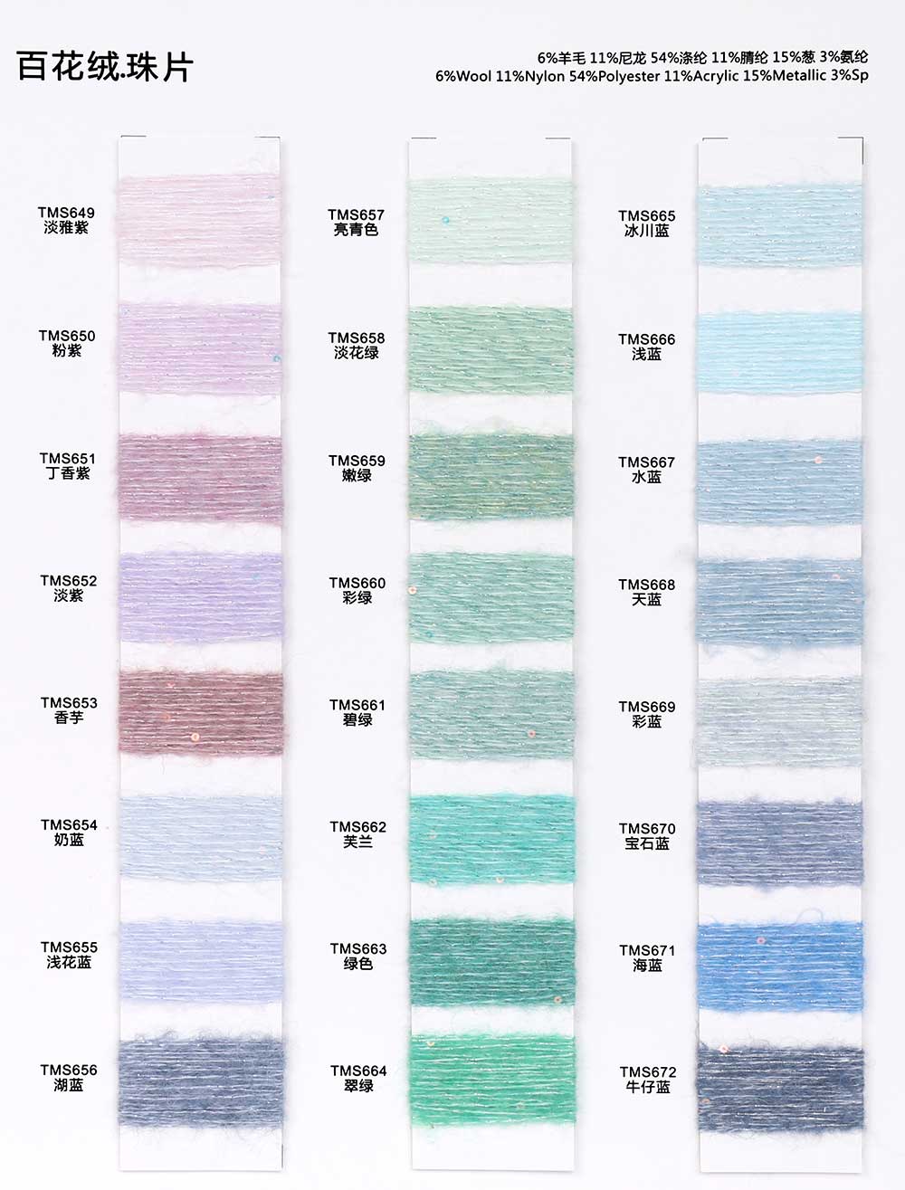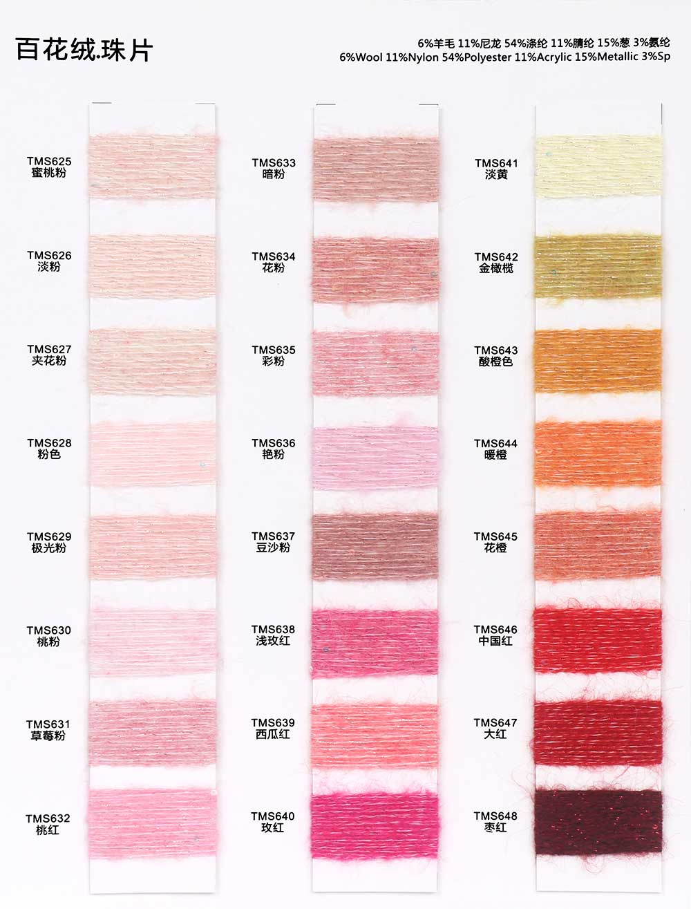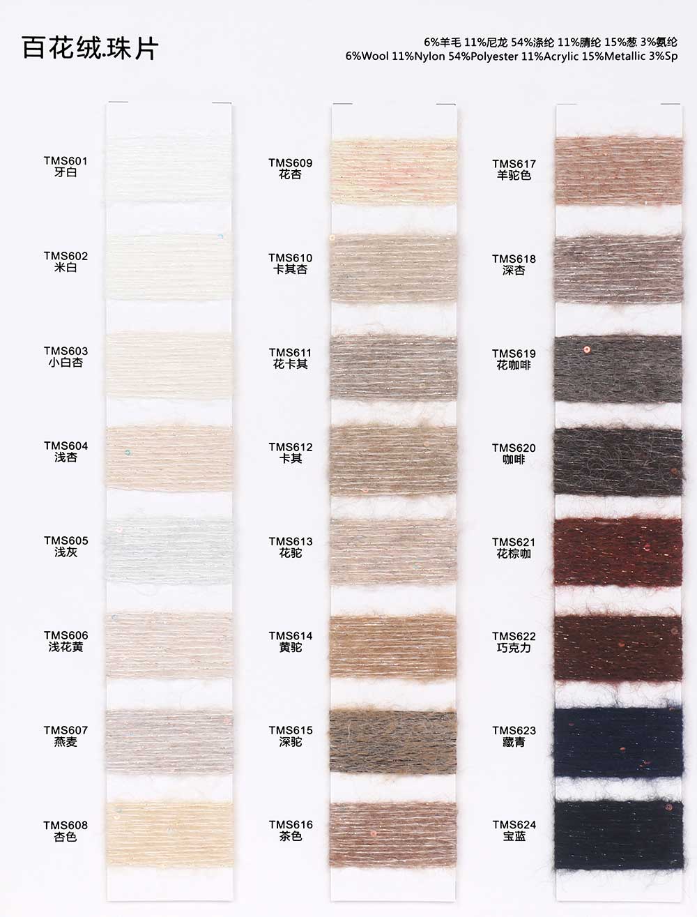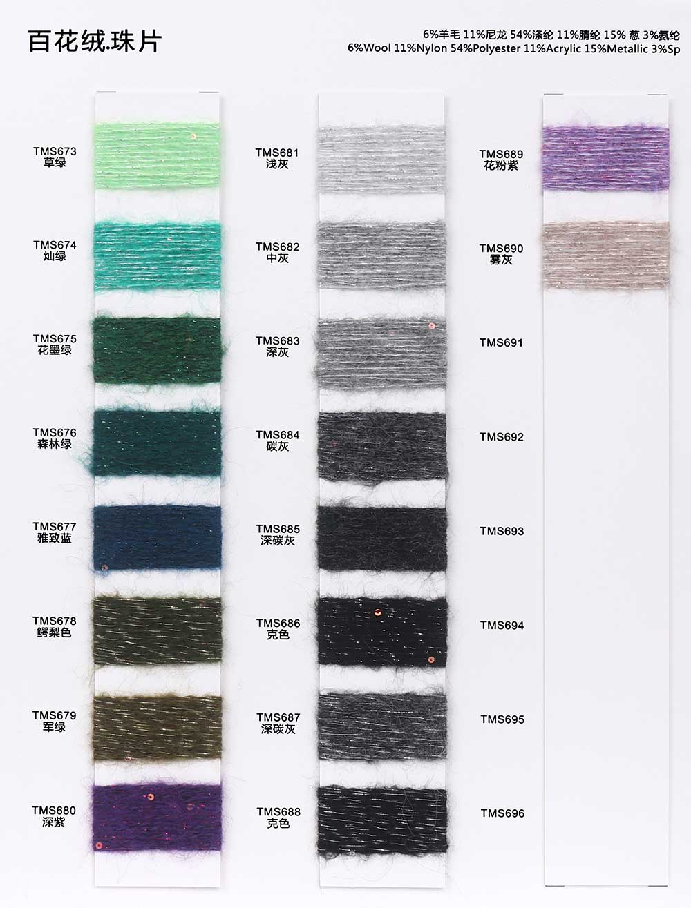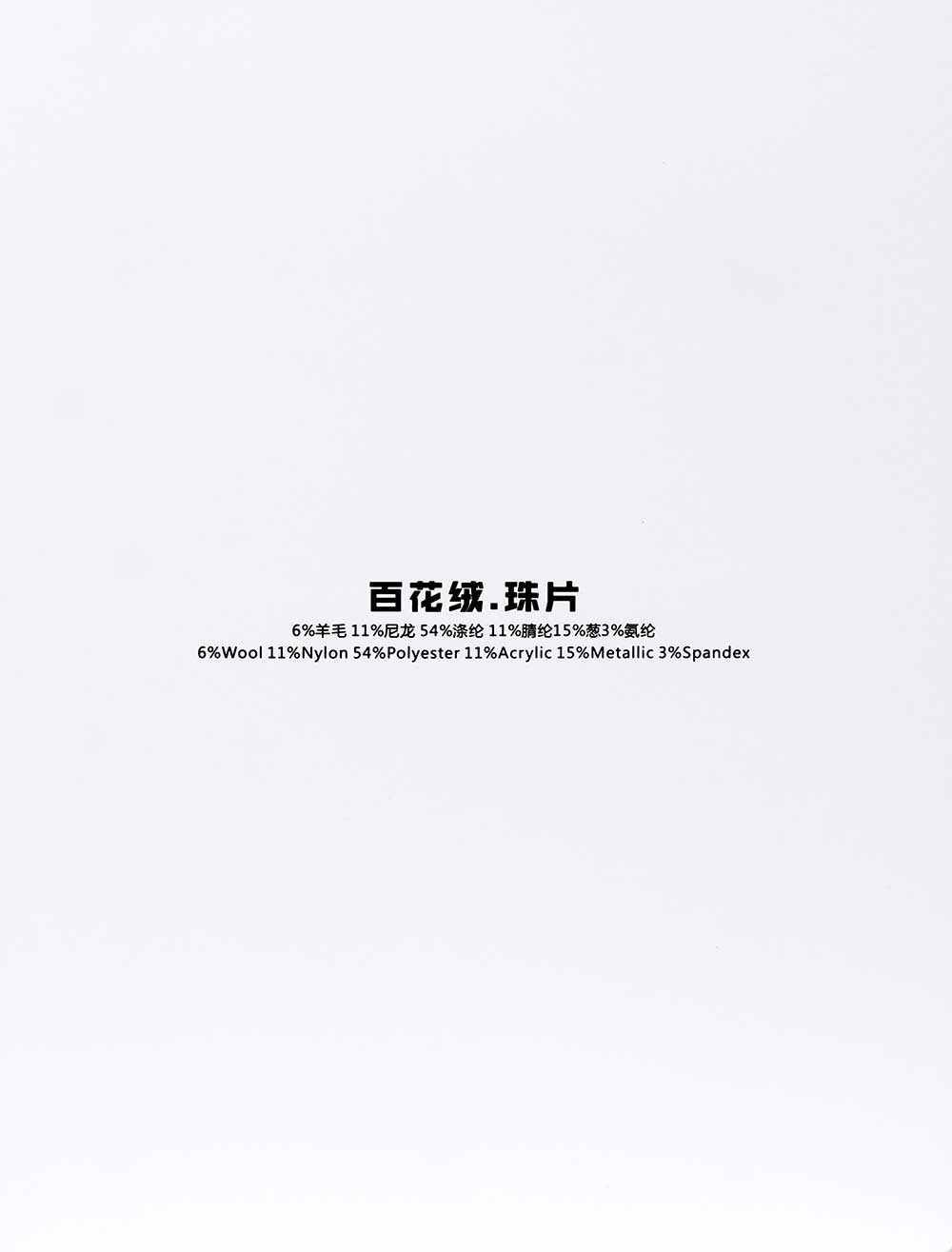 6%羊毛Wool 11%尼龙Nylon 54%涤纶Polyester 11%腈纶Acrylic 15%葱Metallic 3%氨纶Spandex